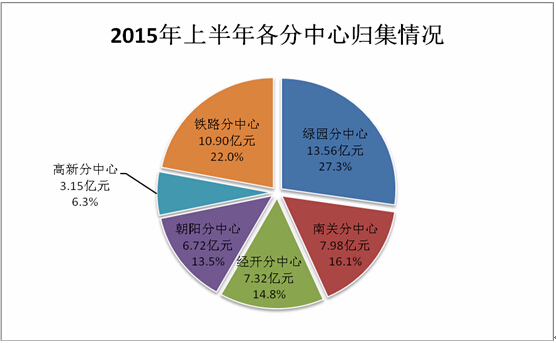 2015年上半年,分中心归集住房公积金情况如下:绿园分中心归集住房公积金13.56亿元,南关分中心归集住房公积金7.98亿元,经开分中心归集住房公积金7.32亿元,朝阳分中心归集住房公积金6.72亿元,高新分中心归集住房公积金3.15亿元,铁路分中心归集住房公积金10.90亿元(具体情况见下图)。