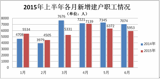 2015年上半年全市新增建户职工34834人,同比减少3169人,下降8%(具体情况见下图)。其中,已建户单位新增建户职工32859人,占94.3%;389户新建户单位新增建户职工1975人,占5.7%。