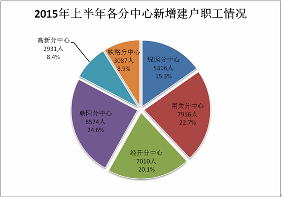 2015年上半年,分中心扩面工作完成情况如下:绿园分中心新增建户职工5316人,南关分中心新增建户职工7916人,经开分中心新增建户职工7010人,朝阳分中心新增建户职工8574人,高新分中心新增建户职工2931人,铁路分中心新增建户职工3087人(具体情况见下图)。