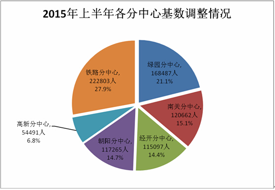 2015年上半年,分中心基数调整工作完成情况如下:绿园分中心已调单位1211户,已调职工人数168487人;南关分中心已调单位1697户,已调职工120662人;经开分中心已调单位1394户,已调职工115097人;朝阳分中心已调单位1410户,已调职工117265人;高新分中心已调单位627户,已调职工54491人;铁路分中心已调单位2208户,已调职工222803人,铁路沿线职工统一按铁路路局文件执行7月1日起调整基数(具体情况见下图)。