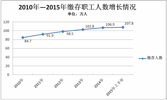 缴存职工人数持续增长,2010年住房公积金缴存人数84.7万人,2014年住房公积金缴存人数已达106.9万人,净增缴存职工22.2万人,截至2015年上半年,我市住房公积金缴存人数为107.8万人,缴存职工人数持续增长。