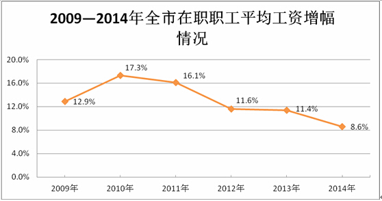 但我市受经济运行形势下行的影响,2014年在职职工平均工资较上一年度增幅仅为8.6%,而自2009年至今6年来,我市在职职工平均工资增幅均保持10%以上,工资增幅的下降、经济增速的放缓直接影响我市住房公积金归集额增速放缓。