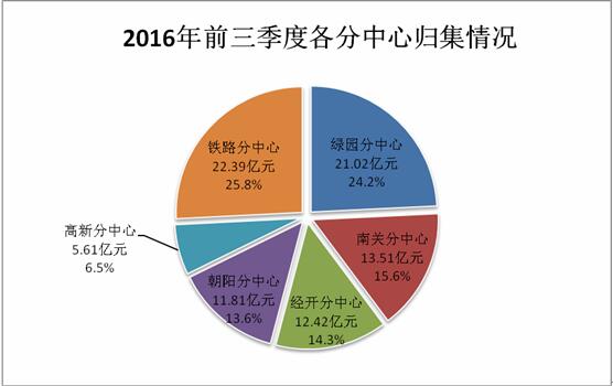 2016年前三季度,分中心归集住房公积金情况如下:绿园分中心归集住房公积金21.02亿元,南关分中心归集住房公积金13.51亿元,经开分中心归集住房公积金12.42亿元,朝阳分中心归集住房公积金11.81亿元,高新分中心归集住房公积金5.61亿元,铁路分中心归集住房公积金22.39亿元(具体情况见下图)。